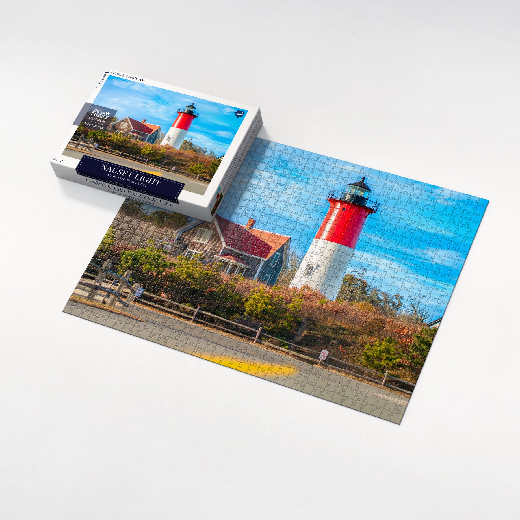 Redesigned for 2025! Nauset Lighthouse is among the most iconic Cape Cod landmarks. The vibrant colors and intricate textures compliment the bold red and white paint of the lighthouse. We hope you have as much puzzle putting this puzzle together as we had creating it! Photo by Cape Cod Puzzle Co. Founder, Andrew Burke.